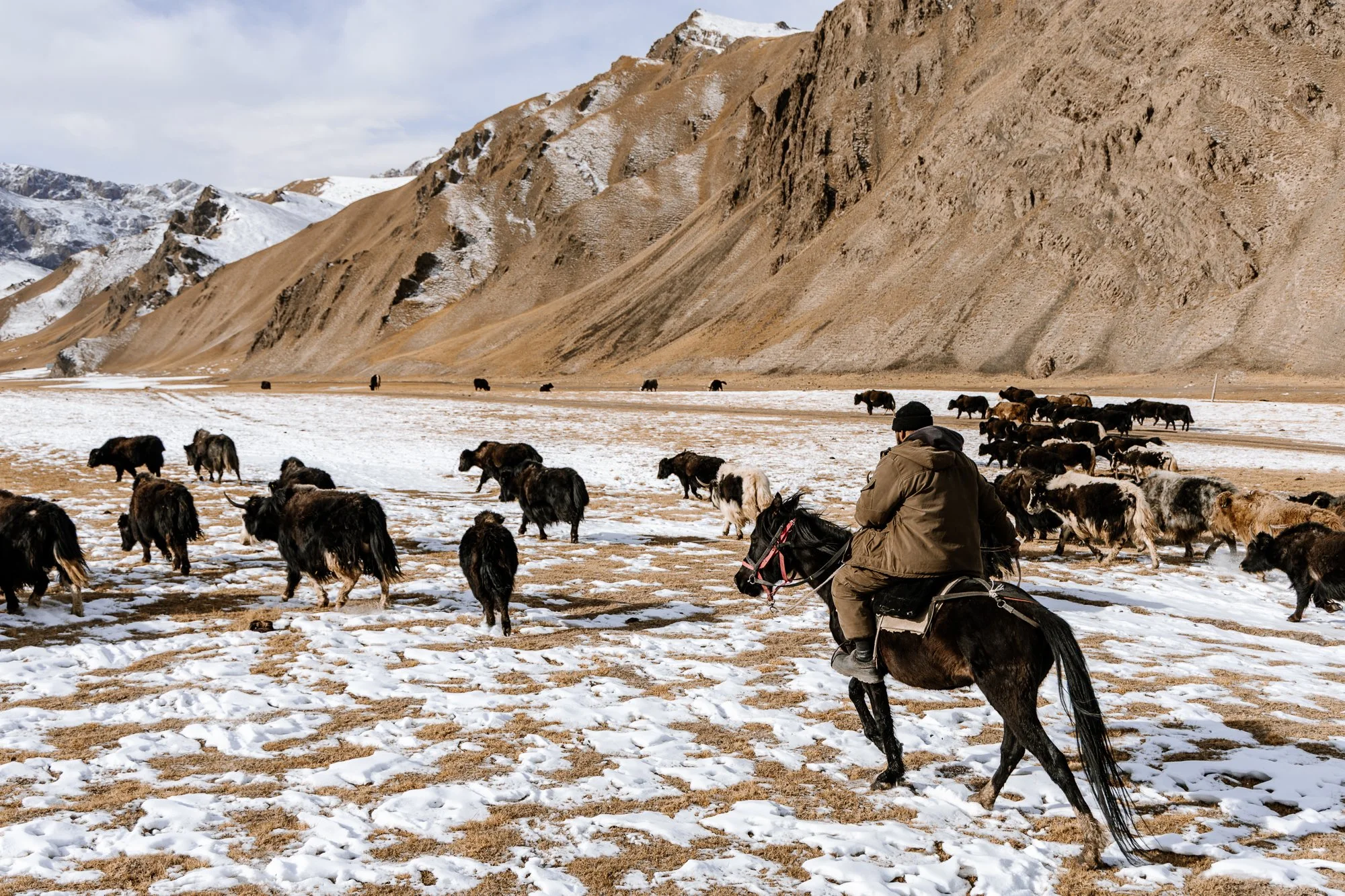 We rallied nearly 100 yaks up the valley toward Kol-Suu Lake, urging our ponies forward with an enthusiastic “chu-chu” until they slipped into a steady canter. Hooves struck frozen ground in rhythm. The yaks moved as a dark tide against the golden pastures.